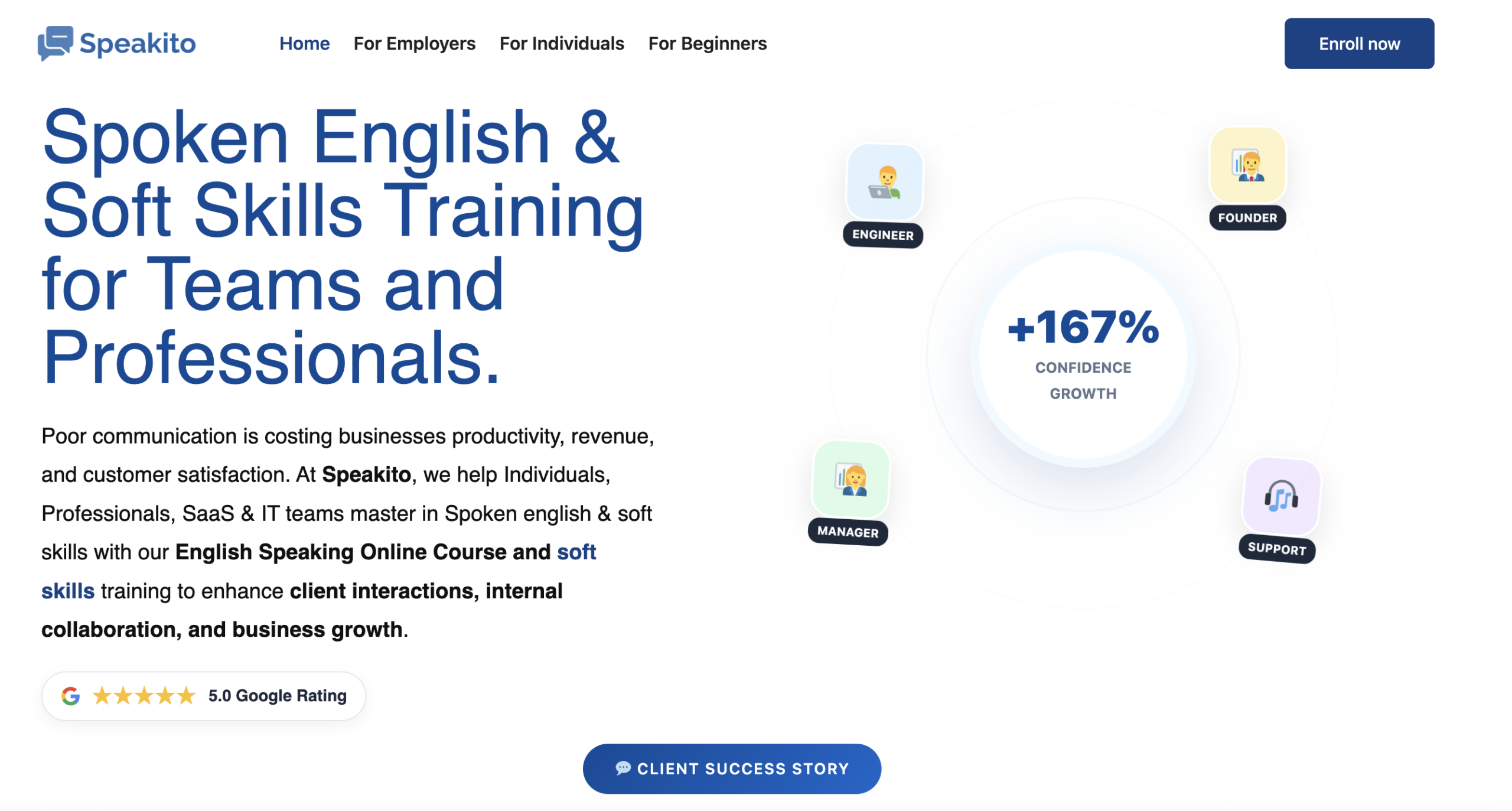 For CEOs looking to upskill their Employees with English Communication & soft skills training, or for individuals looking for the best Spoken English course, Speakito has removed the guesswork from professional development.